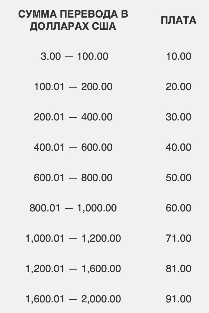 Жесткая банковская конкуренция держит размер комиссии в пределах 0.1% от суммы плюс 10USD или 20USD. Комиссии WesternUnion и MoneyGramm устанавливаются в виде таблицы, где определённому размеру перевода соответствует фиксированное значение комиссии. Тарифы могут выглядеть вот так: