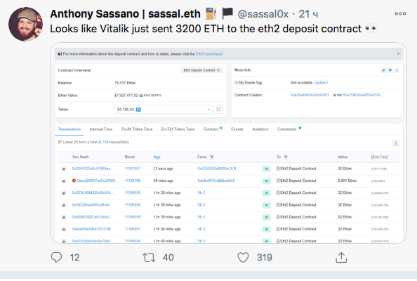 По данным EtherScan, создатель Ethereum Виталик Бутерин внес 3200 ETH - на сумму примерно 1,3 миллиона долларов - на депозитный контракт eth2.