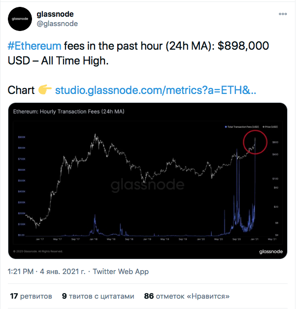 Ситуация выглядит как повторение бычьего забега 2017 года, когда комиссии за транзакции росли после скачков цен. Согласно данным Glassnode, сборы за газ Ethereum достигли нового рекордного максимума в 898000 долларов за один день. Это произошло на фоне скачка цены цифрового актива до 1000 долларов за 24 часа.