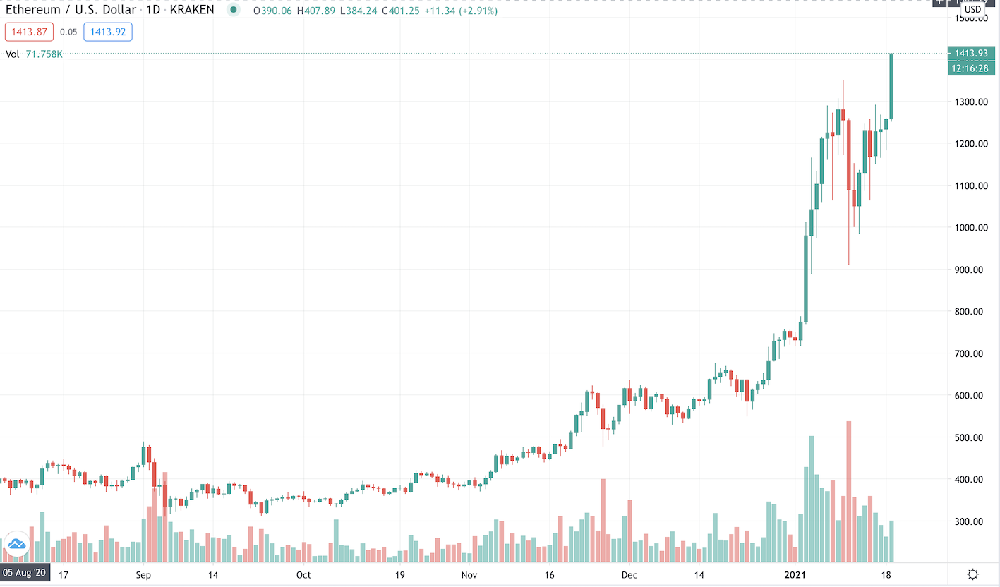 Сегодня, 19 января, цена Ethereum преодолела отметку $1300 и протестировала $1400.