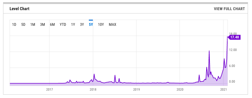 Согласно информации YCharts, средняя цена на газ достигла $17.5 за транзакцию.