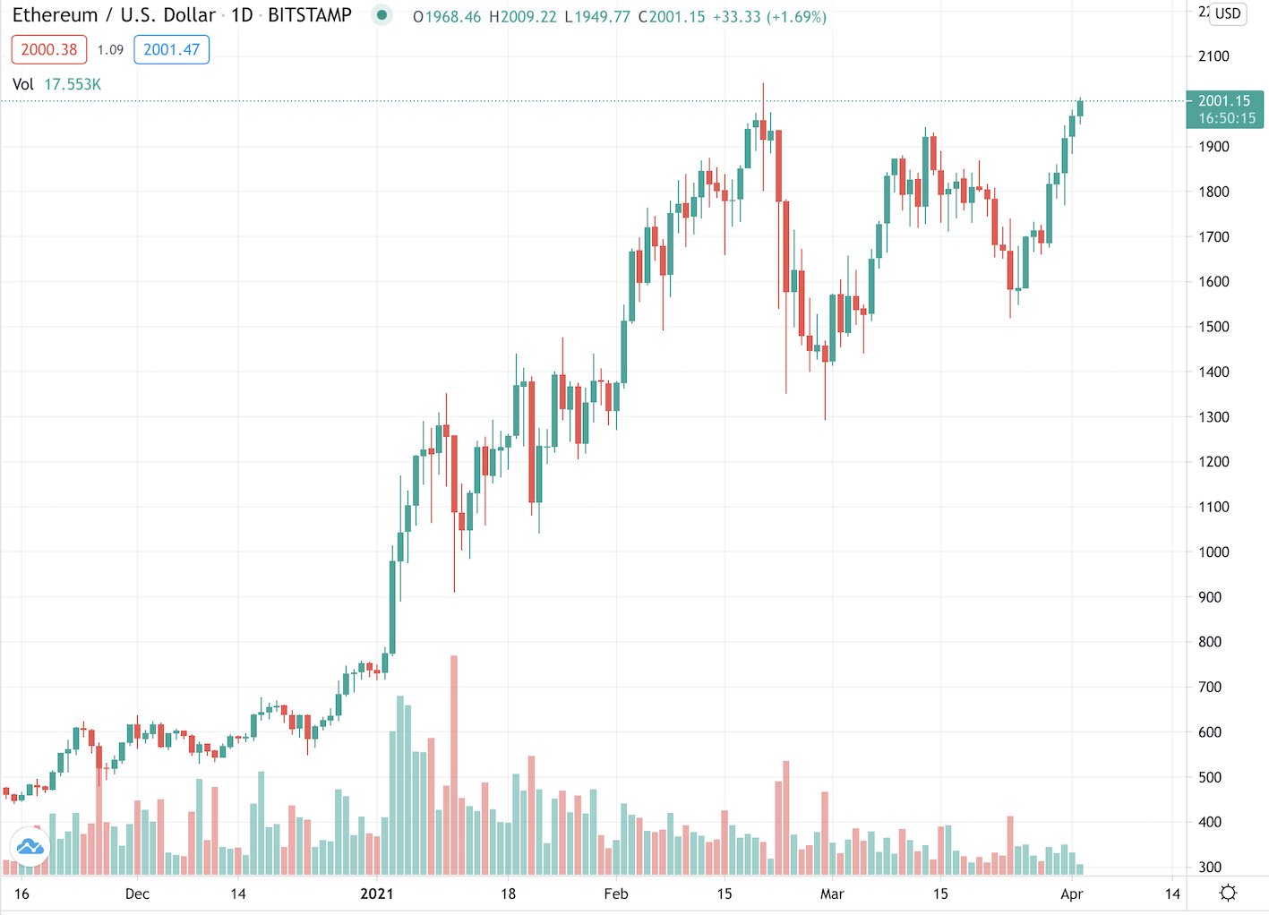 2 апреля цена ETH вновь пробила отметку $2,000 и нацелилась на новые максимумы.