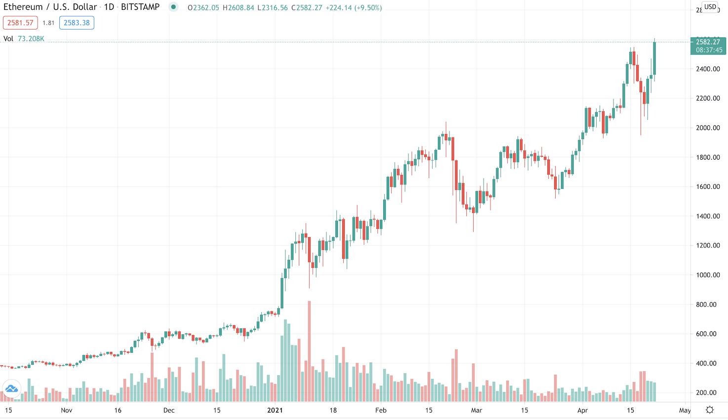 22 апреля цена ETH установила новый рекорд выше $2,600.
