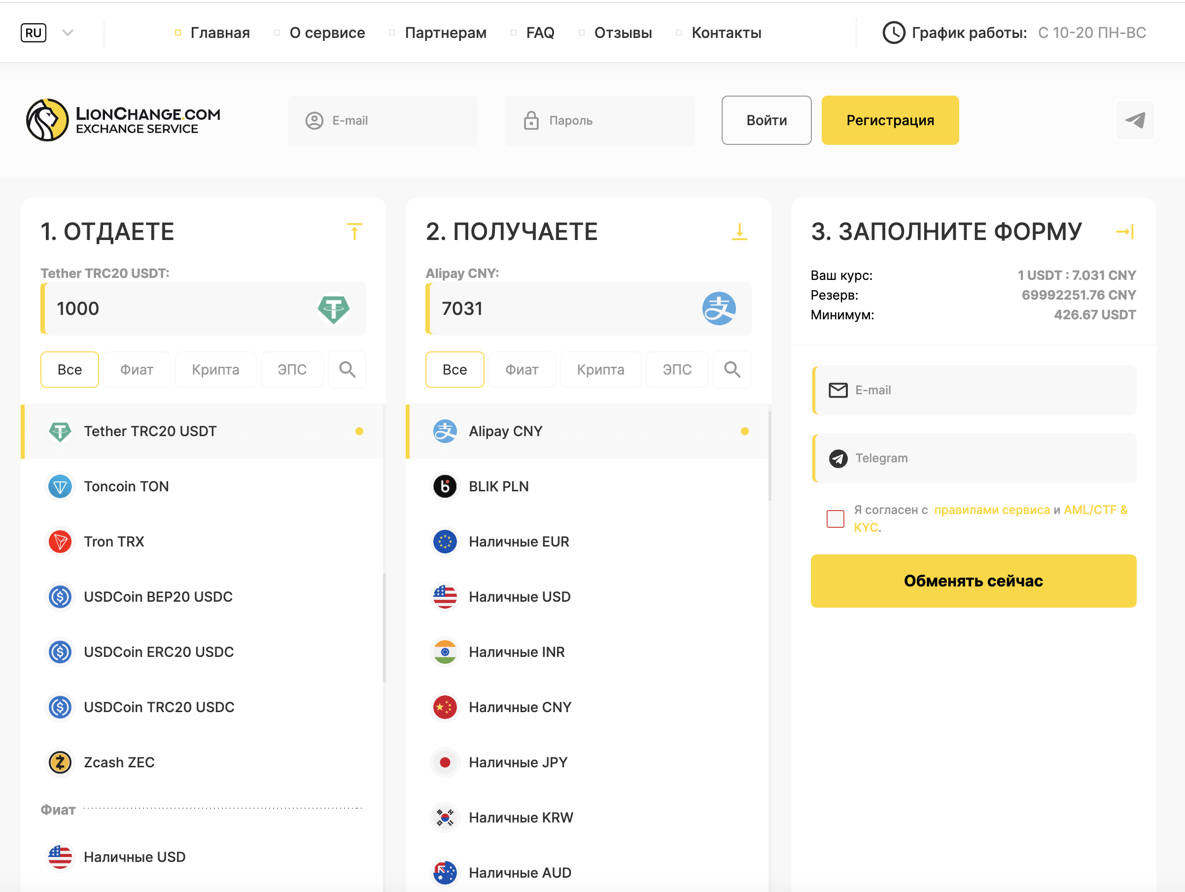 LionChange.com выделяется на фоне аналогов благодаря обширному спектру обменных операций и выгодным курсам. Платформа имеет простой в использовании интерфейс и отзывчивую службуподдержки. Однако стоит учесть, что выбор альткоинов ограничен, а поддержка не 24/7, что не всегда удобно.
