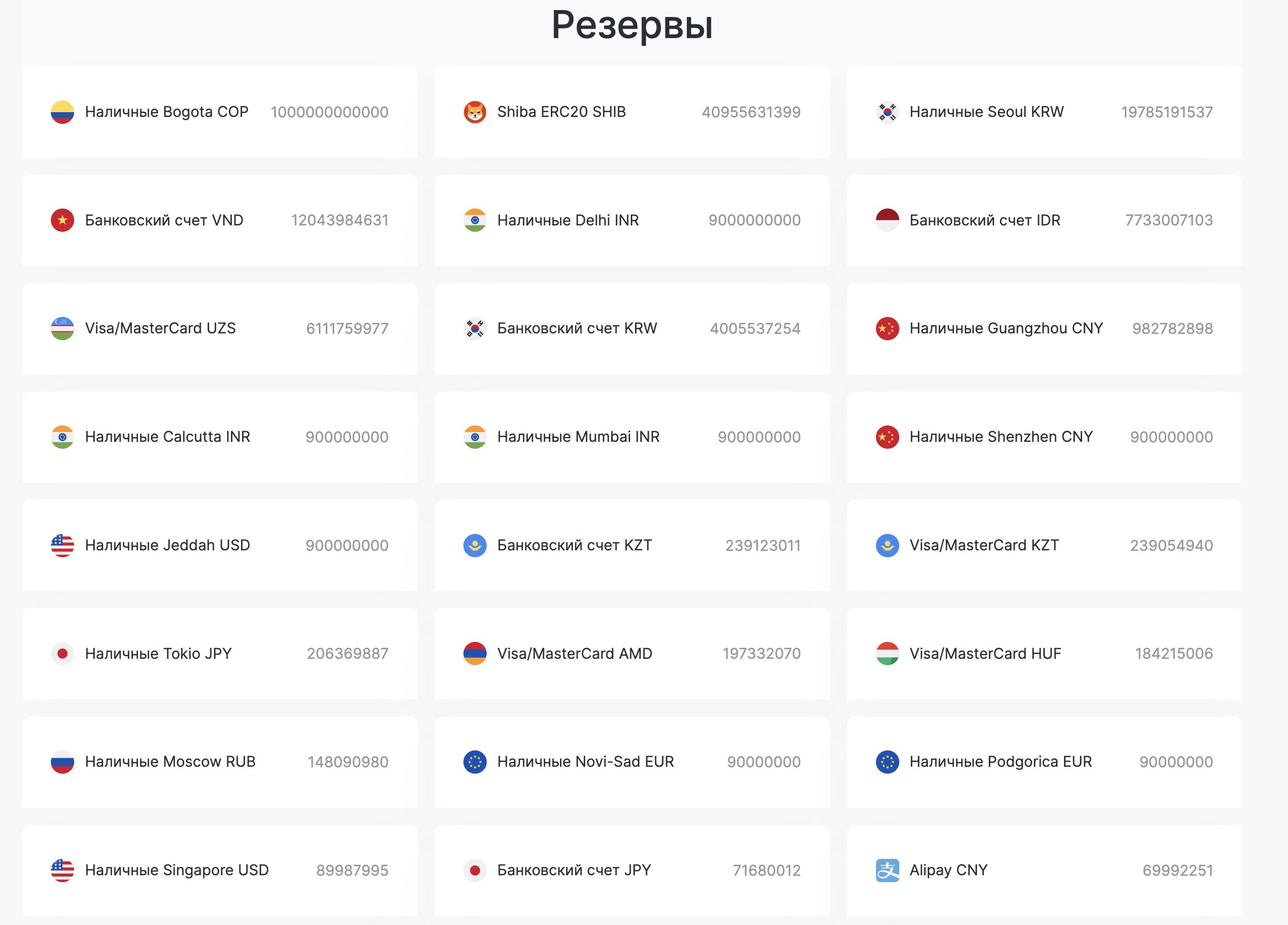 Фиатные валюты:— USD, EUR, RUB, GBP, AED, KRW, AUD, THB, HKD, TJS, UZS, GEL, AZN, NOK, BYN, CZK, HUF, CAD, KGS, TRY, CNY, AMD, MDL, SEK, BYN, PLN, ILS, VND, JPY,IDR,CNY,CHF