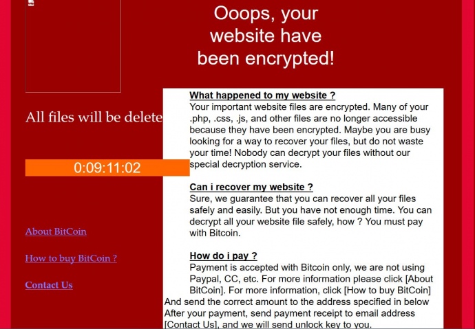 "Ваши важные файлы с сайта зашифрованы... Возможно, вы отчаянно ищете средства восстановить свои файлы, но не теряйте времени! Никто не сможет расшифровать ваши файлы без нашего особого сервиса раскодировки"