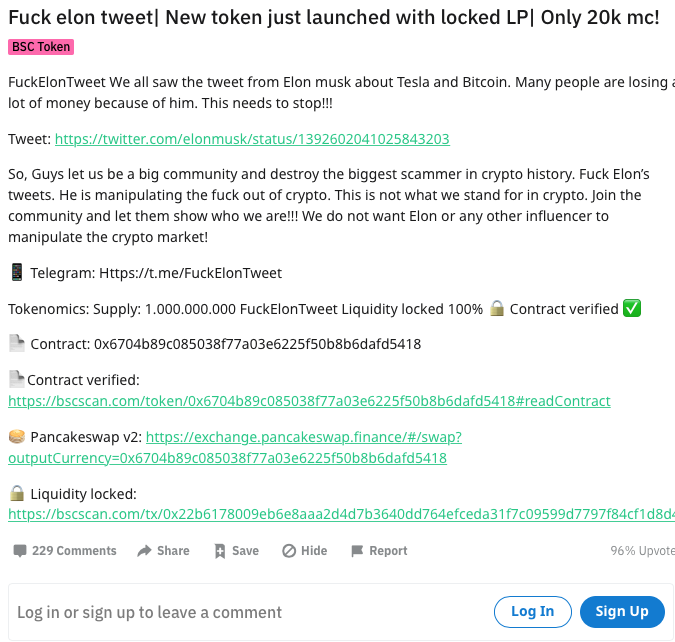Анонс новой монеты появился вскоре после заявления Tesla об отказе от приема биткоина за электромобили. Сообщество /CryptoMoonShots обвиняют Маска в манипулировании рынком при помощи твиттера, в результате которого многие инвесторы потеряли деньги..