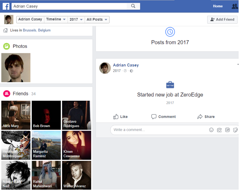 Сотрудники ZeroEdge также фейковые. Название учетных записей и имен веб-аналитика Мариссы Пирс и финансового директора Зои Голан отличаются (название учетной записи можно увидеть в URL-адресе), вы также не найдете о них никакой дополнительной информации в интернете, а их список друзей наполнен абсолютно случайными людьми.