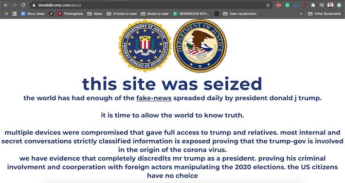 Скриншоты, распространяемые в Интернете, показывают, что на веб-сайте на короткое время отображалось сообщение, сопровождаемое значками ФБР и Министерства юстиции США.