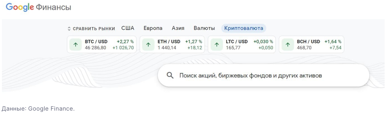 Поисковая система добавила специальную вкладку, которая позволяет мониторить курс основных криптовалют в Google Finance.