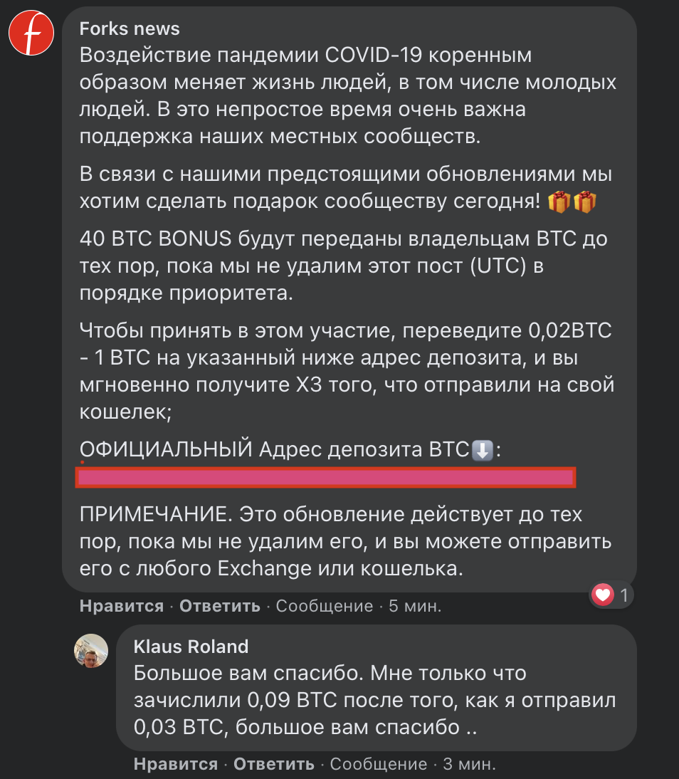 Предупреждаем тех, кому подобные "предложения" кажутся привлекательными - никогда не отправляйте свои биткоины незнакомцам в интернете. В 100% случаев вы не получите их назад.