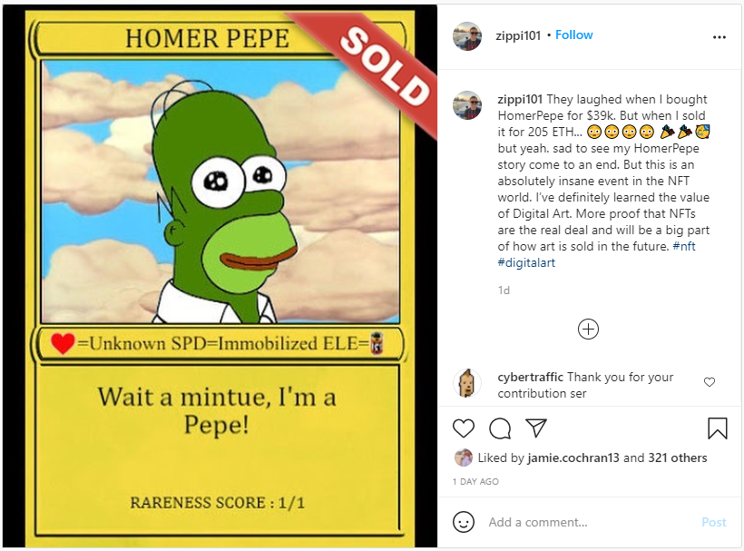 Единственная в своем роде коллекционная карточка, на которой изображен Гомер Симпсон, нарисованный в стиле лягушонка Пепе, была продана 1 марта за 205 ETH ($320,000).