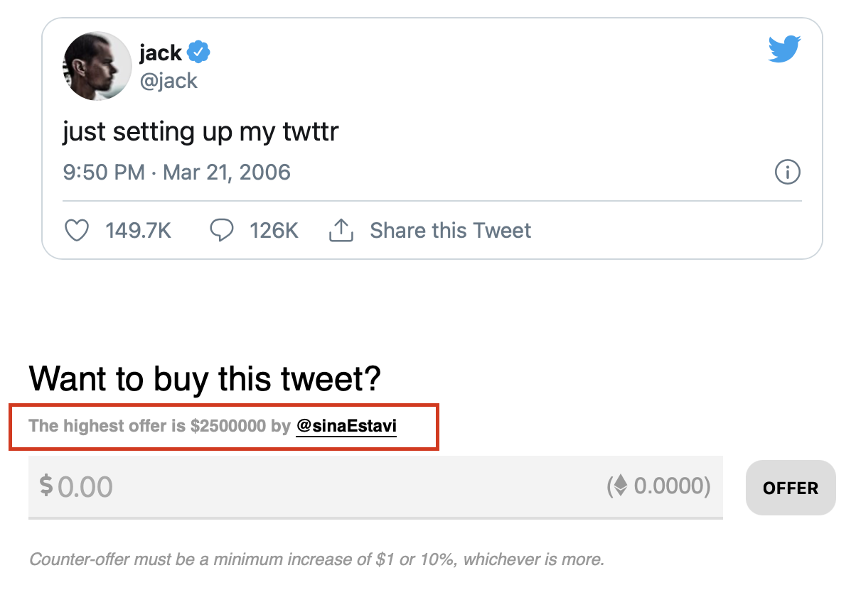 Твит был выставлен на аукционе еще в декабре прошлого года, но объявление привлекло внимание только после того, как соучредитель Twitter разместил ссылку на продажу на площадке Valuables by Cent.