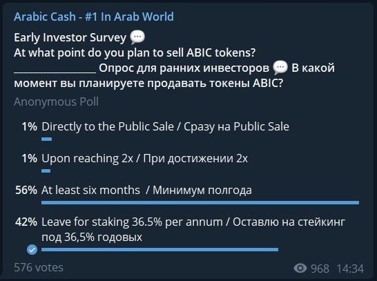 Сейчас у проекта проходит Второй Раунд Private Sale. И судя по заявлениям на официальных каналах Arabic Cash ранних инвесторов становится все больше с каждым днем и абсолютное большинство беспрекословно верит в дальнейшее развитие проекта. По внутреннему опросу Arabic Cash - 97% ранних инвесторов готовы удерживать токен ABIC в долгую: 56% - минимум полгода, 41% - больше года, храня средства в стейкинге под 35,6% годовых.