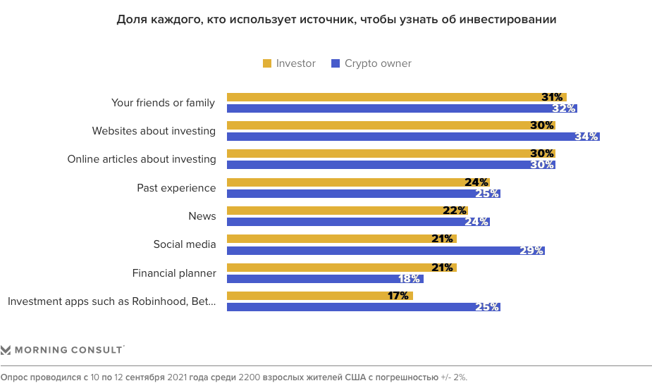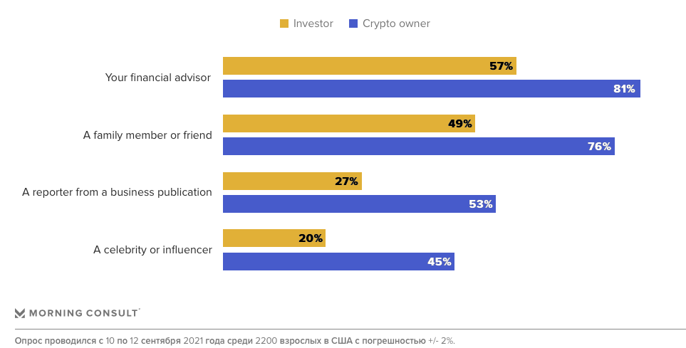 Проведя опрос среди 2,2 тыс. американцев, аналитики выяснили, что почти половина владельцев криптовалюты обращаются к знаменитостям за советом, но финансовые консультанты все же имеют больше влияния на принятие решений.