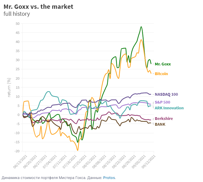 Хомяк Гокс начал трейдить 12 июня 2021 года с суммы $390. C того момента его портфель активов вырос до $580.