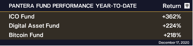 Согласно ежемесячному письму инвесторам Pantera Capital, многолетний бычий рынок еще не стартовал, но фонд компании, ориентированный на первичное размещение монет, с начала года до настоящего времени вырос на 362%. Фонд цифровых активов, ориентированный на токены децентрализованного финансирования, в этом году вырос на 224%.