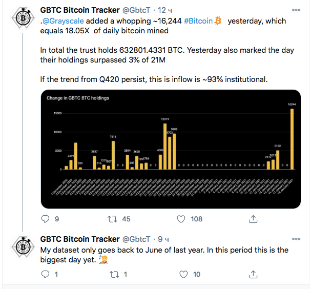 Только за один день Grayscale купила в 18 раз больше биткоинов, чем майнеры могут произвести за сутки. В среднем ежедневно добывается около 144 блоков. Следовательно, майнеры BTC могут производить только 900 BTC.