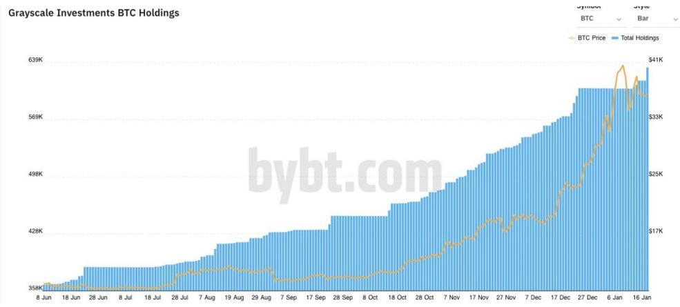 Согласно информации ByBt, 18 января Grayscale увеличила свои запасы на 16 244 BTC, на сумму около $600 млн. В конце прошлого года фонд добавил в свои хранилища 12,319 BTC ($285.5 миллионов).