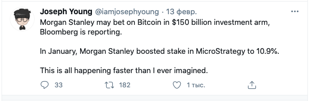 Morgan Stanley уже проявлял интерес к криптоинвестициям. В январе банк приобрел 11% акций Microstrategy, считая это прибыльным вложением для своих клиентов.