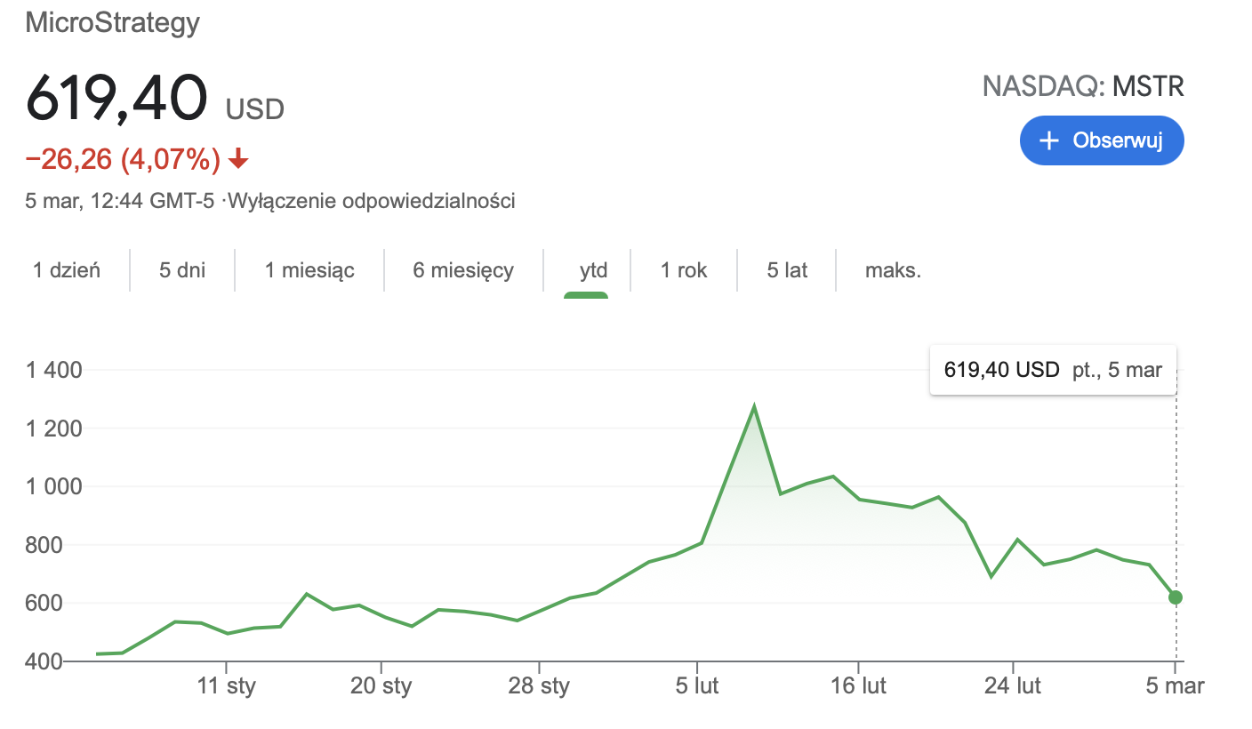Падение биткоина ниже $50,000 напрямую повлияло на цену MSTR, которая спустилась с $1300 до $629 всего за 17 дней.