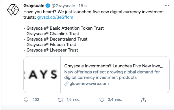К семейству Grayscale присоединились фонды LINK, BAT, MANA, FIL, LPT. Минимальная сумма инвестиций составляет 25 000 долларов, а годовая комиссия 2,5%.