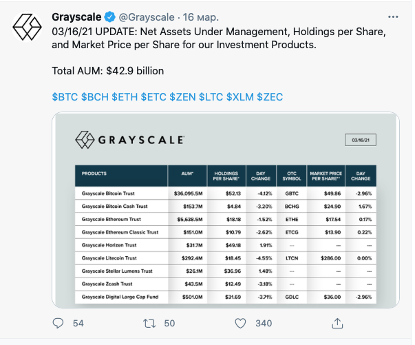 Тем временем Digital Currency Group, материнская компания Grayscale, заявила в марте, что планирует приобрести акции GBTC на сумму до 250 миллионов долларов.