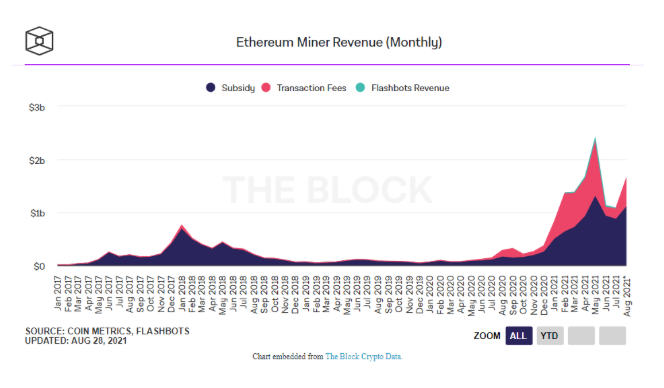 В августе майнеры ETH получили доход в $1,65 млрд, из которых $556 млн были получены с комиссий за транзакции. Остальная прибыль поступила он награды за блоки.