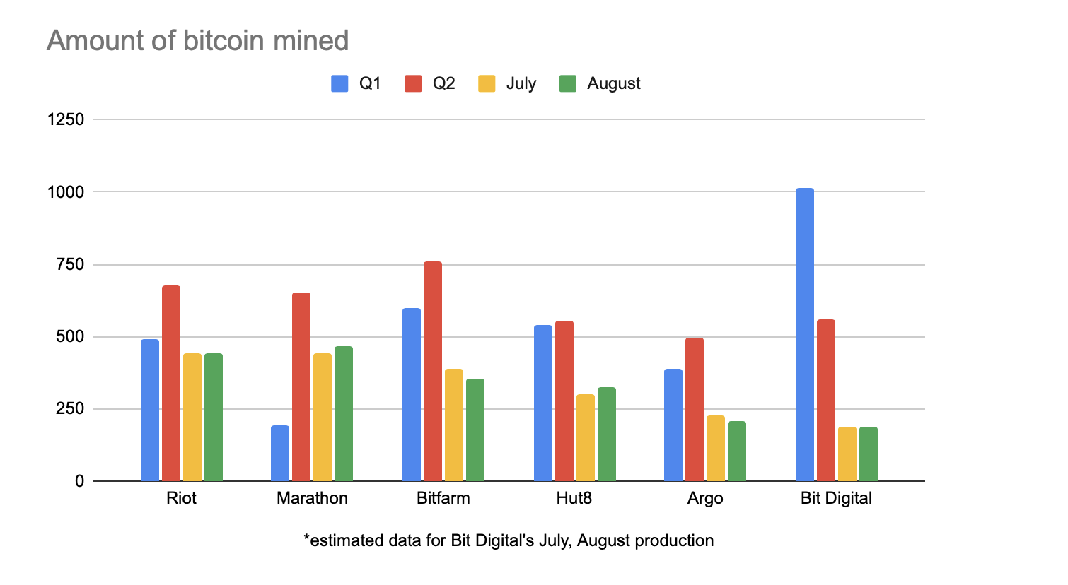 В августе Riot, Marathon, Bitfarm, Hut8 и Argo в общей сложности добыли 1,796 BTC.