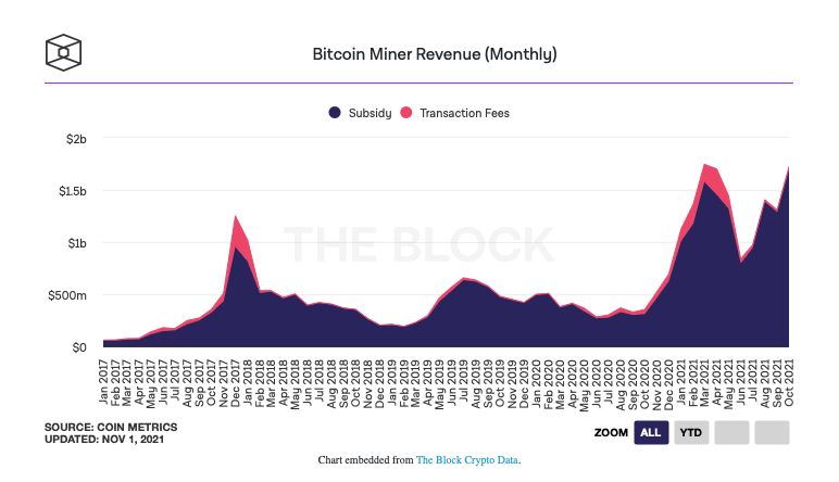 Согласно ежемесячным данным The Block, биткоин-майнеры заработали 1,72 миллиарда долларов в октябре, достигнув второго по величине значения.