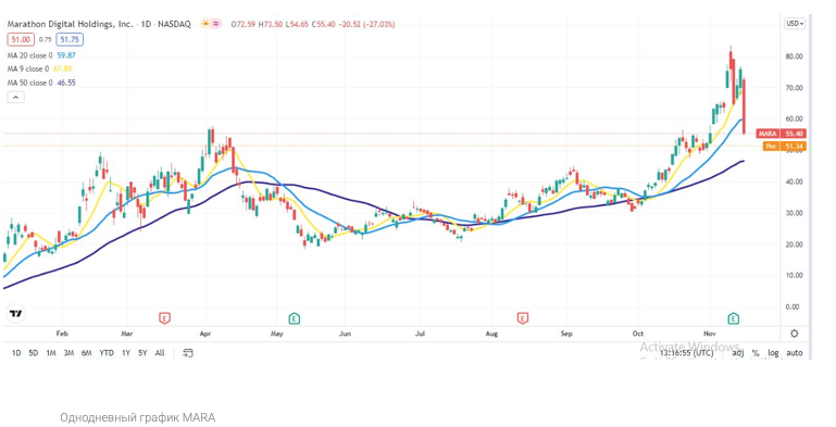 Акции Marathon Digital Holdings (MARA) продемонстрировали стремительное падение на 27% в понедельник и продолжили спад более чем на 6% на премаркете во вторник.