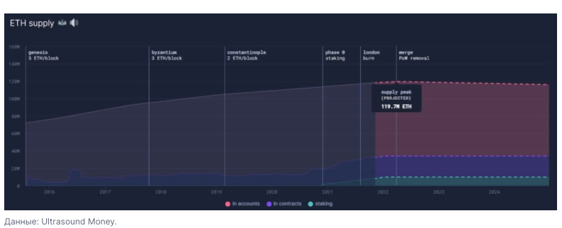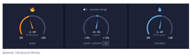 Годовая инфляция ETH составила меньше 1%, при выпуске 5,4 млн ETH и сжигании 4,3 млн монет.