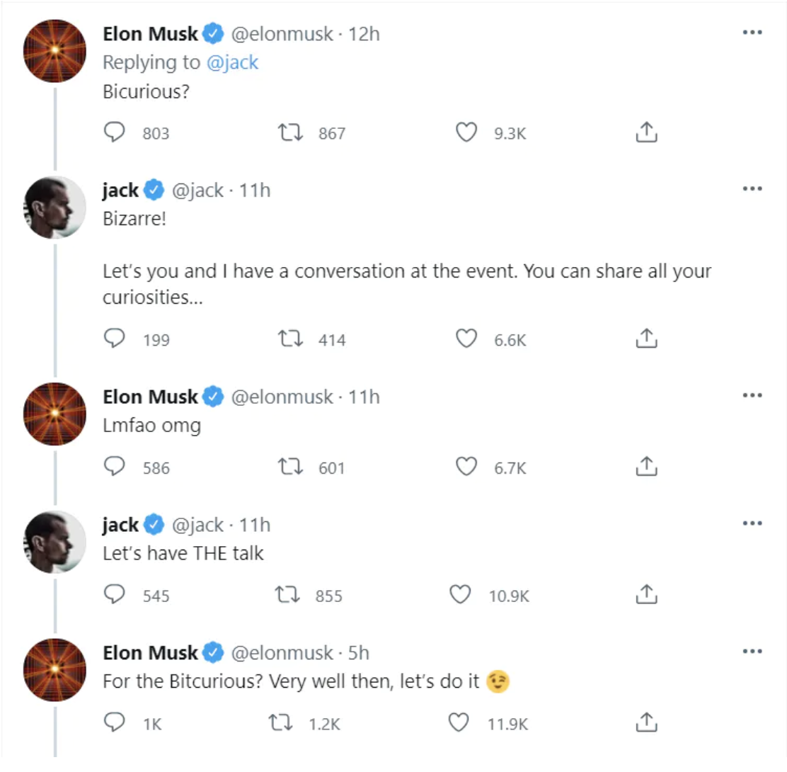Глава Tesla Илон Маск согласился провести диалог с CEO Twitter Джеком Дорси на криптовалютном ивенте, который пройдет 21 июля.