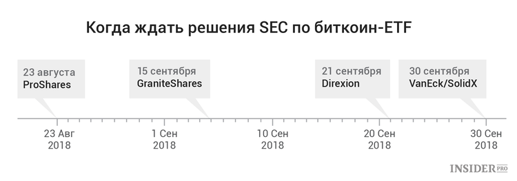 Документы ProShares ETF, были первоначально поданы в SEC 19 декабря прошлого года, через неделю заявка была опубликована в федеральном реестре. Однако SEC уже трижды переносила принятия решения, 30 января , 23 марта и 15 июня. Теперь по правилам Комиссии, она исчерпала все возможности отсрочки рассмотрения заявки и 23 августа - последняя дата.