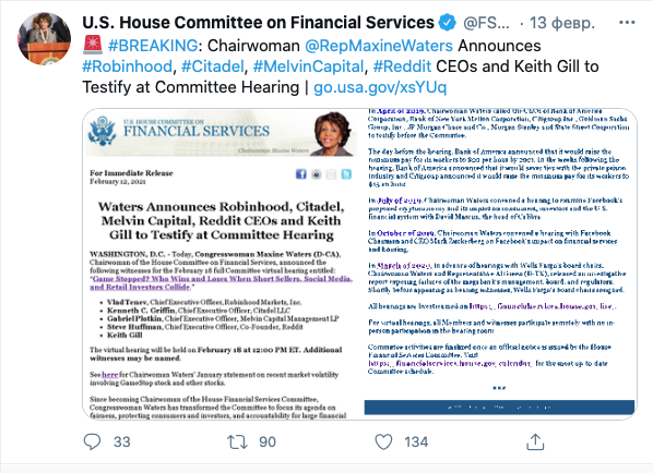 Комитет Сената по банковскому делу также планирует провести слушания по «текущему состоянию фондового рынка». Слушание Дома, которое имеет запоминающееся название «Игра остановлена? Кто выигрывает и проигрывает, когда сталкиваются шортисты, социальные сети и розничные инвесторы », - будет транслироваться в прямом эфире 18 февраля.