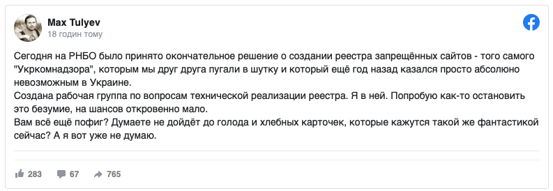 Максим Тульев, член Интернет Ассоциации Украины, примет участие в подготовки и реализации проекта, однако он категорически против такой политики. По его мнению, реестр создается в угоду крупных операторов, однако подрывает доверие к украинской судовой системе.