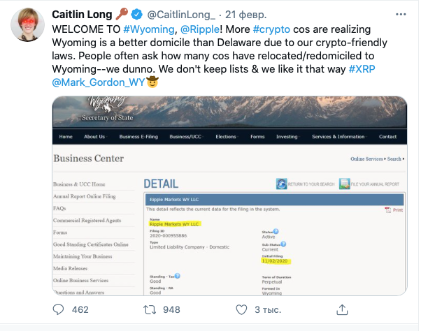 О планах по смене юрисдикции компания упоминала еще осенью прошлого года. На фоне затянувшейся юридической тяжбы с SEC, Ripple приняла окончательное решение о переезде в Вайоминг.