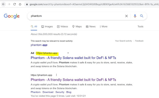 - Использование поддельных URL-адресов в поисковых системах для кражи паролей от уже созданных ранее криптокошельков.