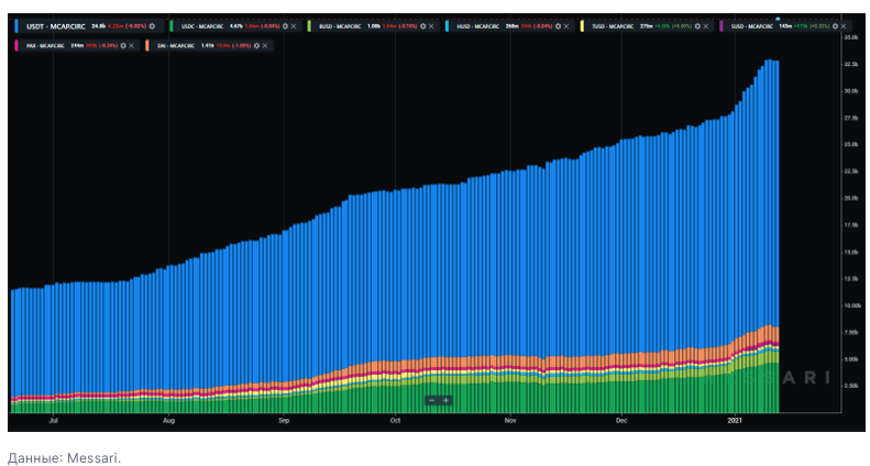 В начале прошлого года на рынке циркулировало всего 4,8 миллиарда USDT. Сейчас, согласно информации Messari, предложение стабильной монеты составляет более 24,6 миллиардов.