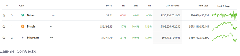 По данным CoinGecko, суточный объем торгов крупнейшим стейблкоином составил $150,8 млрд, в то время как оборот биткоина - $102,7 млрд.
