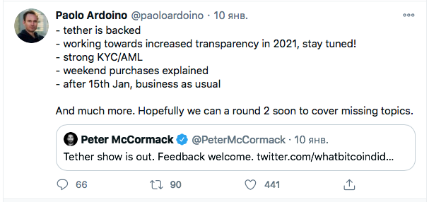 Паоло Ардоино отметил, что USDT обеспечен фиатными резервами в полной мере и в наступившем году намерен усилить соблюдение требований KYC/AML и улучшить прозрачность компании.