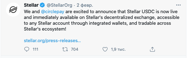 Stellar USDC объединяет долларовый стейблкоин с сетью Stellar. В своем твитте представители Stellar уточнили, что пользователи могут торговать USDC на децентрализованной бирже Stellar и использовать стабильные монеты по всей экосистеме.