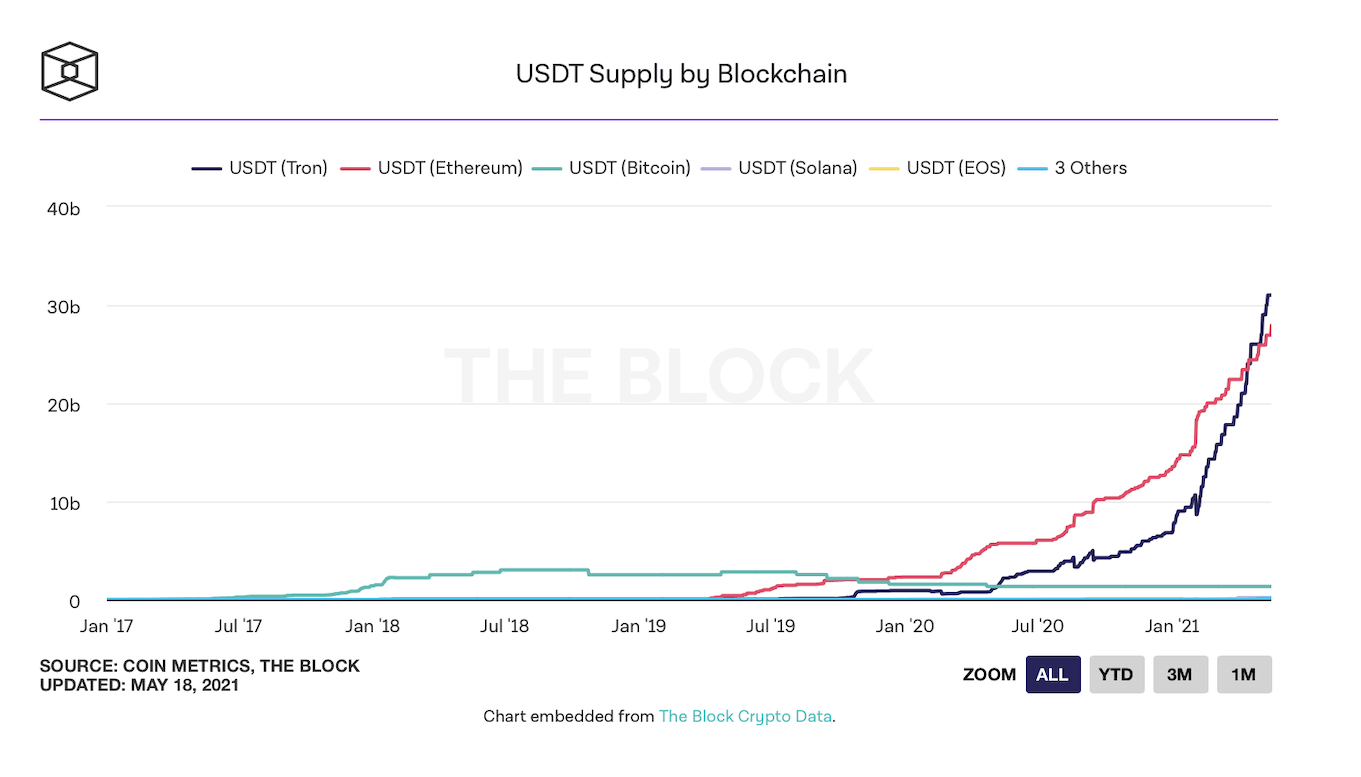 Высокие цены за газ в сети Ethereum повысили популярность USDT на других блокчейнах, прежде всего на Tron. Согласно информации TheBlock, общее предложение USDT на Tron уже превзошло обращение USDT на эфириуме.