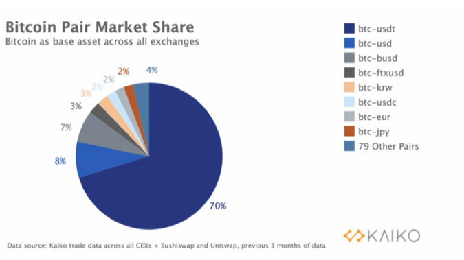 На рынке сейчас выделяются три лидирующие торговые пары - это BTC/USDT, BTC/USD и BTC/BUSD. Если посмотреть на долю рынка в объеме для всех пар, в которых биткойн является базой, доминирование Tether составит до 49%. Пара ETH-BTC занимает второе место с общей долей рынка 13%.