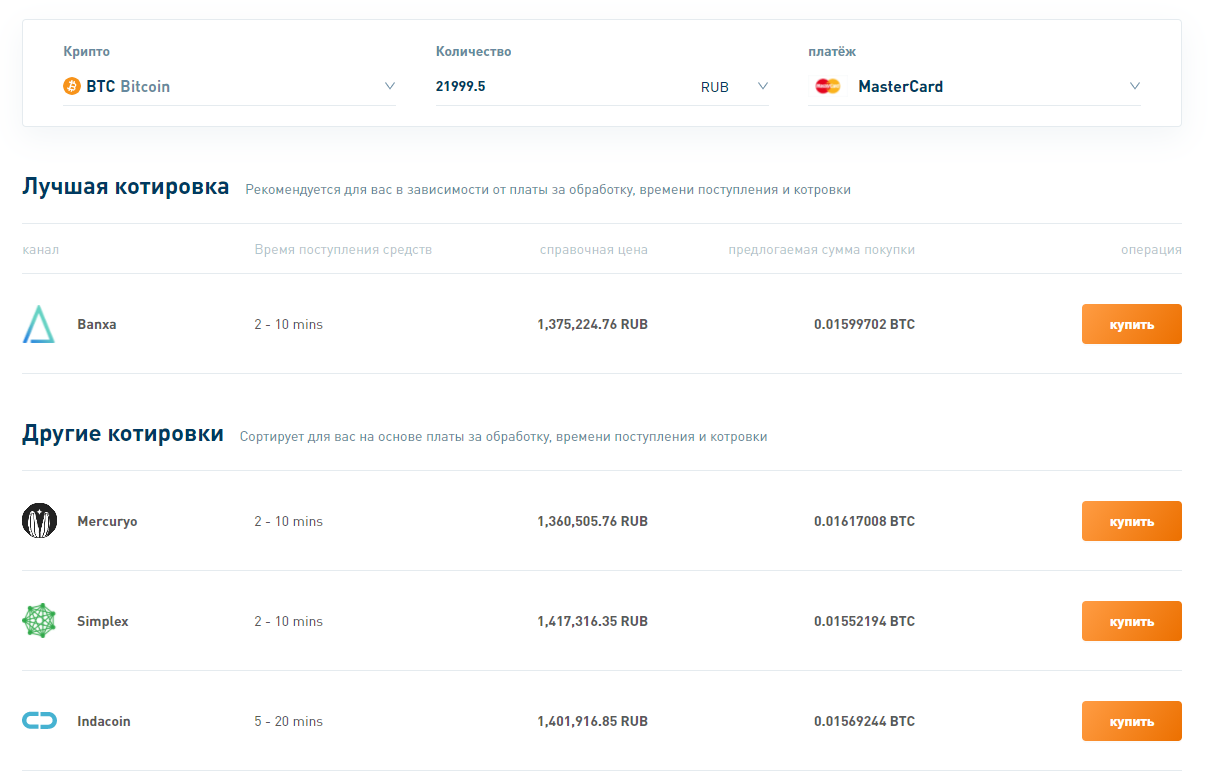 Шаг 4. На следующей странице вы увидите доступные фиатные шлюзы для проведения операции, которые отличаются курсом и скоростью проведения транзакции. Выбирайте наиболее подходящий и нажмите “Купить”