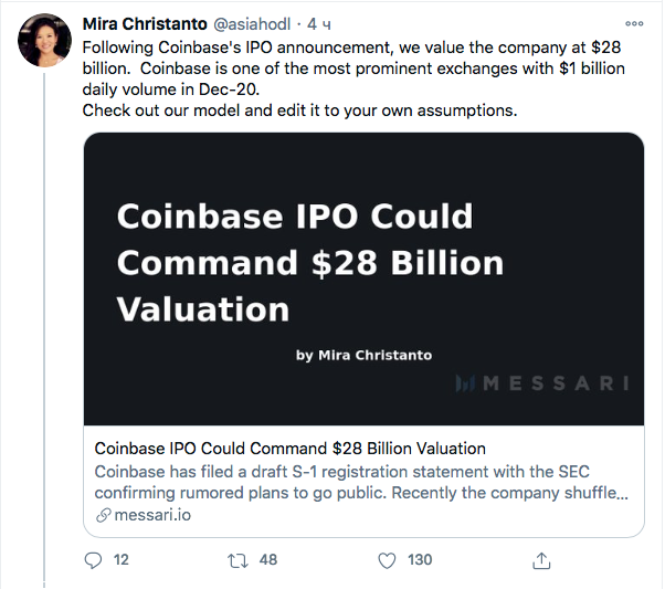 После обретения компанией публичного статуса, ее капитализация может вырасти до $28 млрд, по мнению экспертов из Messari.