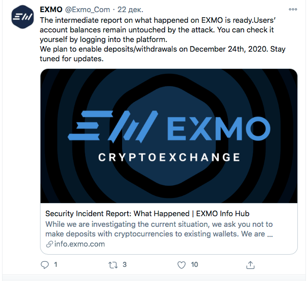 «Похищенные в результате взлома суммы составляют около 6% от общих активов компании. Мы не думаем, что это может как-то повлиять на основу непрерывной деятельности EXMO».
