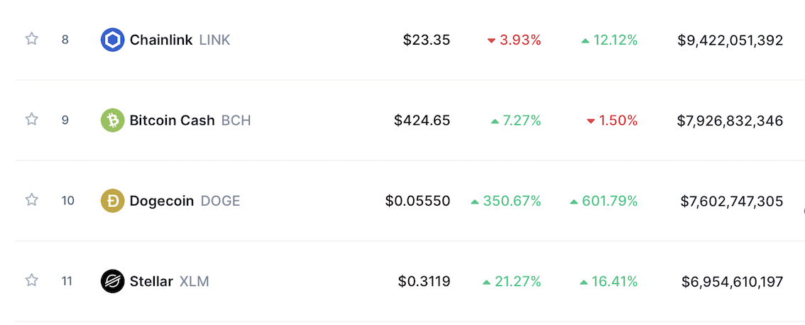 Robinhood также приостановил торговлю криптовалютой Doge. За последние два дня ее цена взлетела на 900%. Впервые с 2015 года монета снова оказалась в топ 10 криптовалют по капитализации.