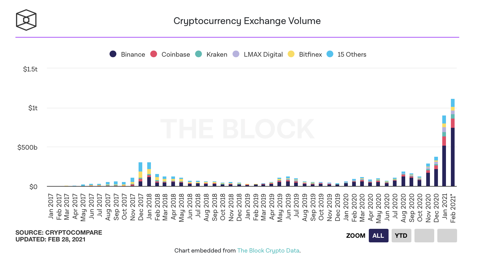 Согласно информации The Block Research, в феврале объем торгов на крипто биржах впервые в истории преодолел отметку $1 триллион.