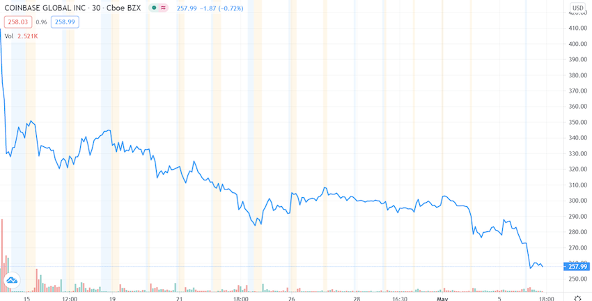 Даже несмотря на продолжающийся рост крипто рынка (а точнее, рынка альткоинов), акции Coinbase продолжают стабильно падать.